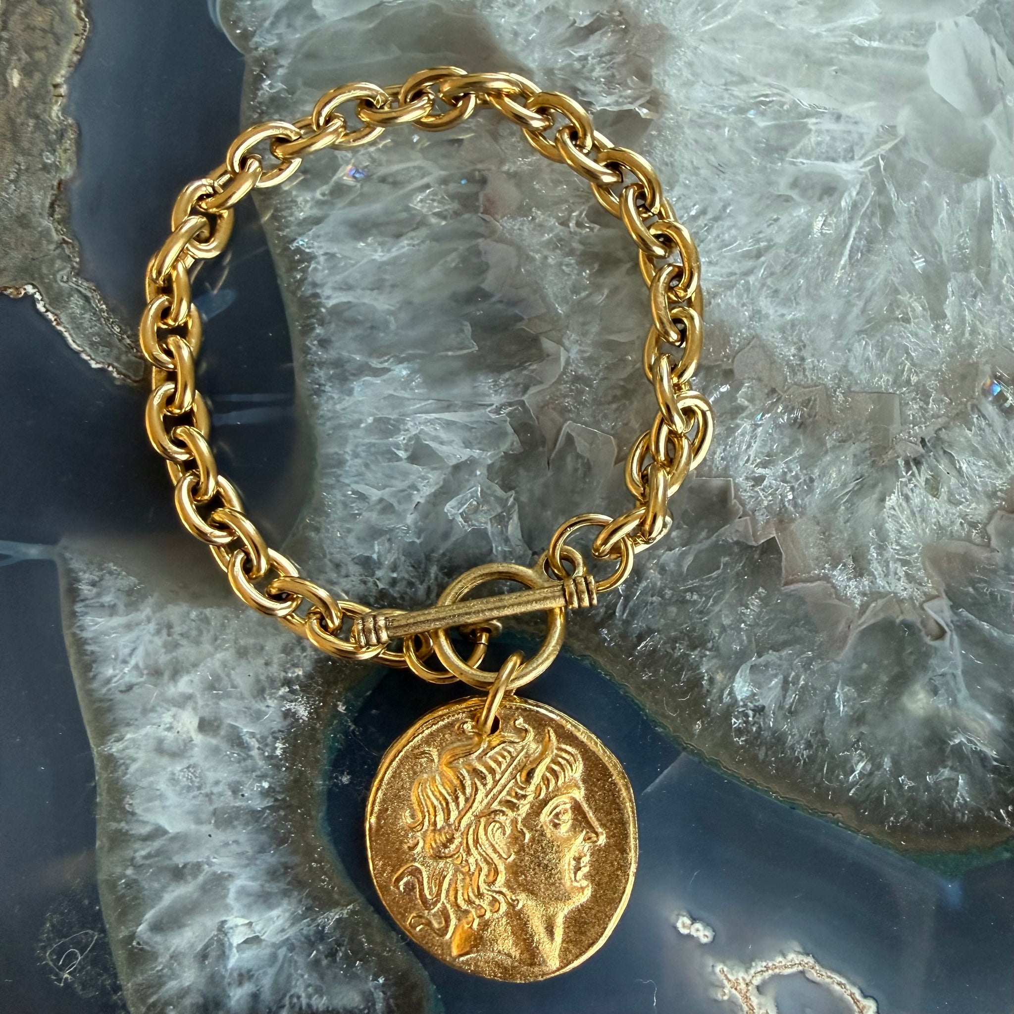 An everyday chain link bracelet with a toggle clasp, adorned with an Alexander the Great ancient coin (replica).